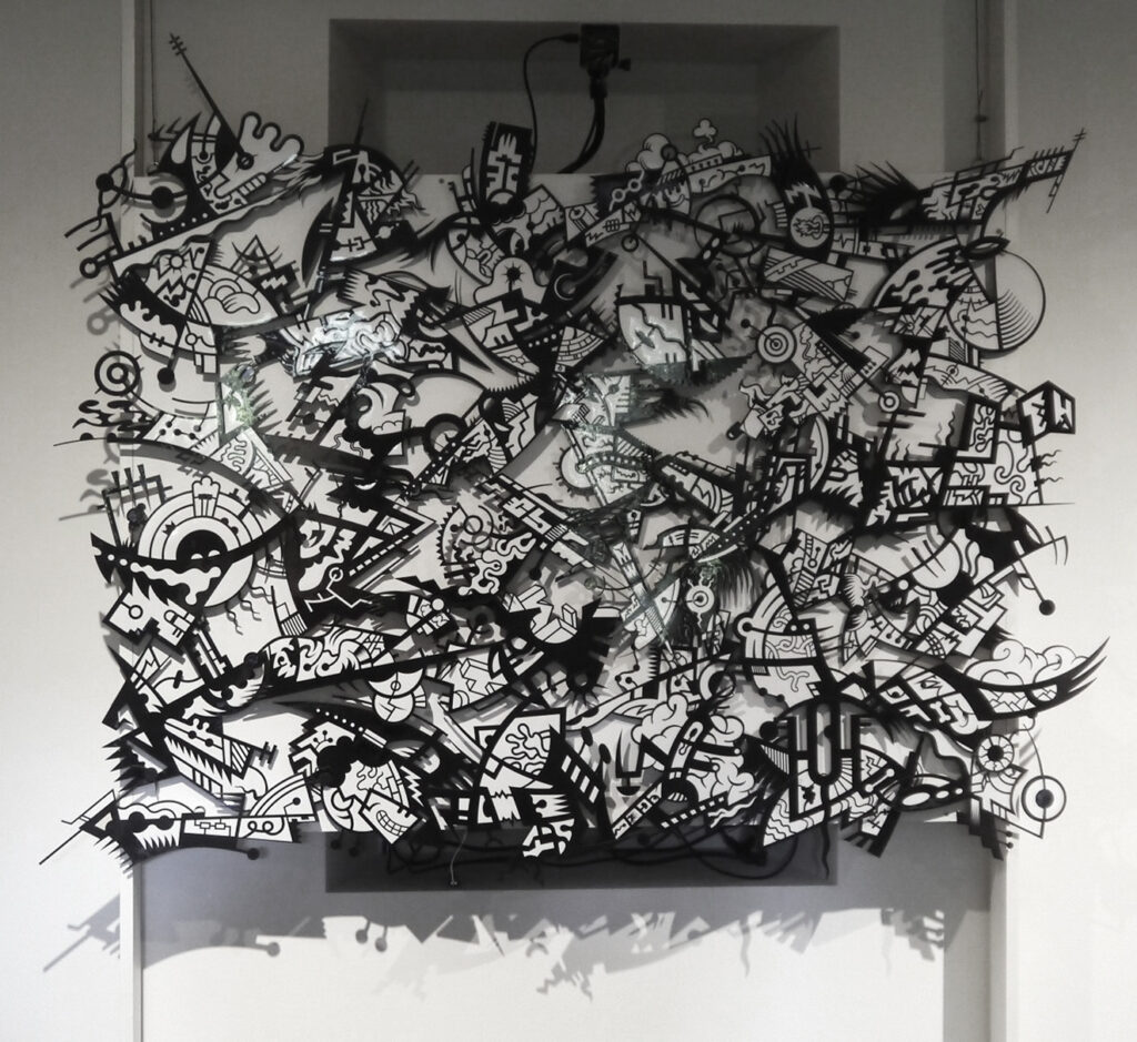 Ein schwarmartige Ensemble von 27 Einzelkompositionen aus schwarzem Plexiglas. Zwischen flach, flächig, vielfach durchbrochen, bis hin zum eckig oder kurvig Linearen, streben die Einzelelemente vom Zentrum weg. Vergleichbar mit Blitzen und Schallwellen einer Explosion. Mit Abständen zur Wand montiert, so dass jedes Objekt sein Schatten-Double auf dem weißgetünchten Hintergrund erzeugt.