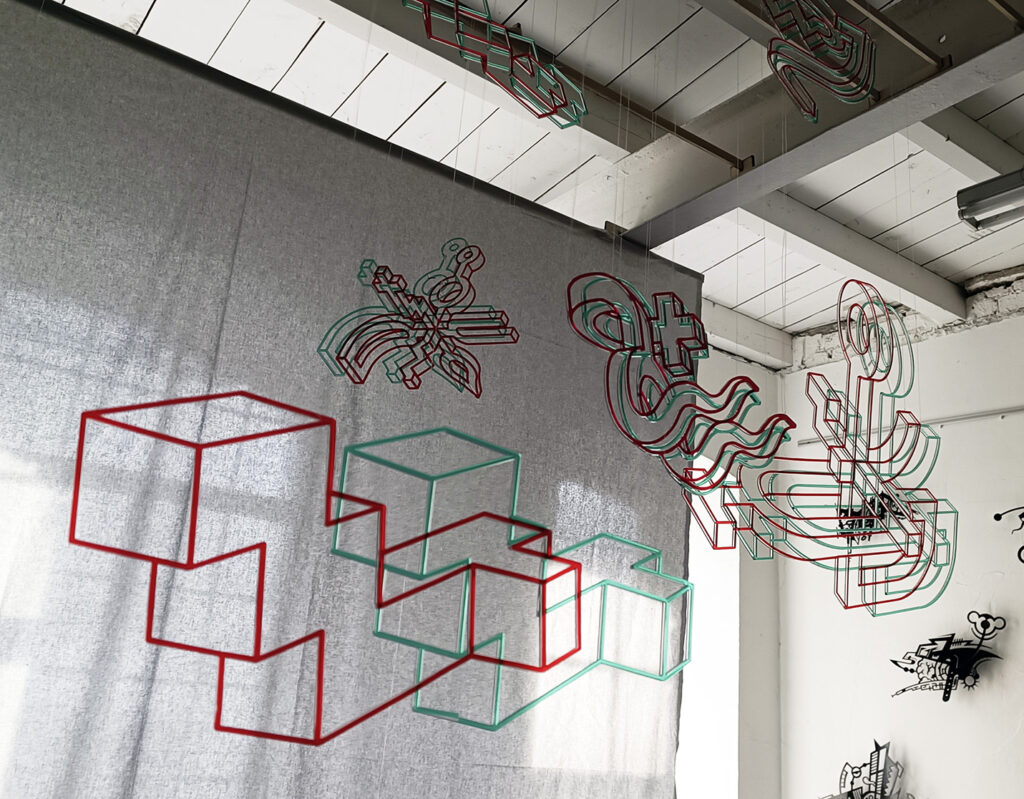 Eine weiterführende Installation, auf der virtuell/realen Fuzzle-Basis. 10 freischwebenden Anaglyphen, die per Rot/Grün 3D-Brille betrachtet werden können. Die Anaglyphenpaare aus Plexiglas sind in einer bestimmten, räumlichen Tiefenstaffelung aufgehängt. Der Blick durch die 3D-Brille erschafft nicht nur ein virtuelles 3D-Bild der Elemente, sondern zeigt auch eine neue Anordnung im Raum.