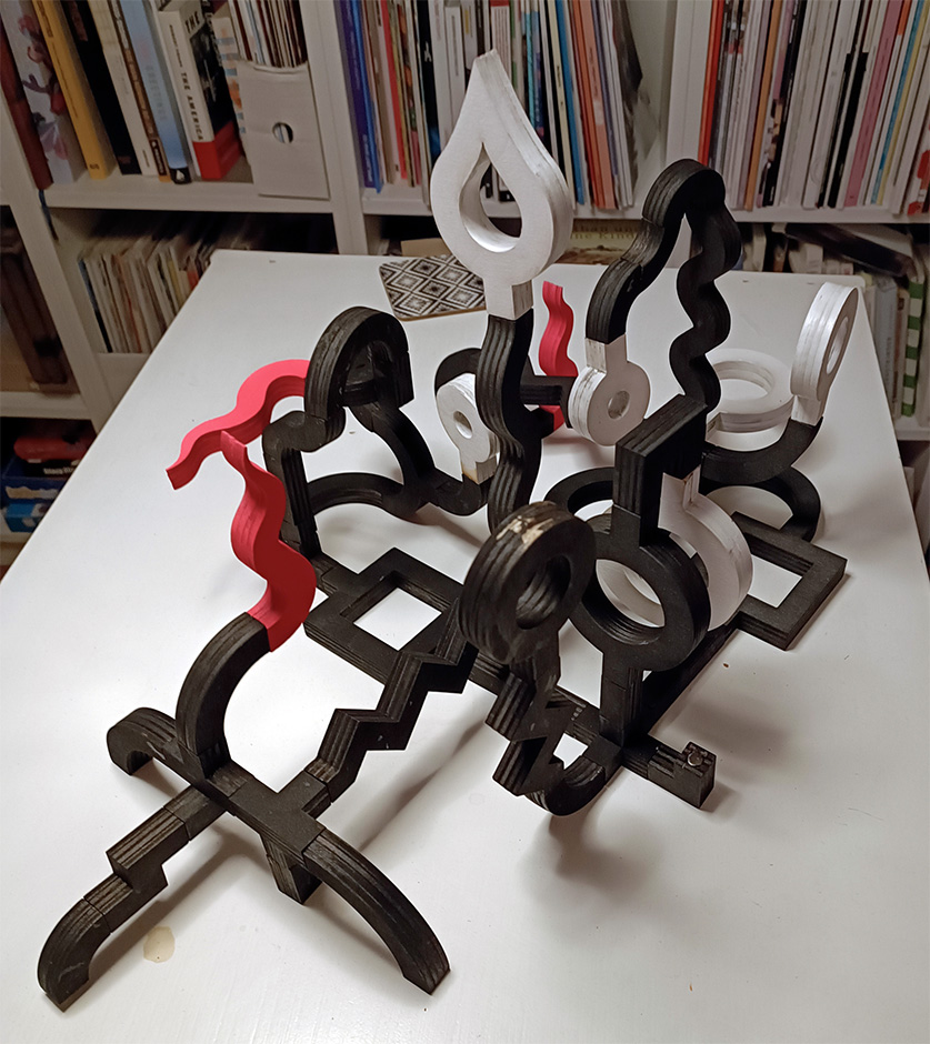 Unter diesen Kriterien entstand 2021 die Idee zu Almost Certain. Anfangs ein statisches Bild als Siebdruck, aber in der Folge als plastisches und gleichzeitig veränderbares Objekt ausgeführt. Geometrische Grundformen aus schwarzlackiertem Holz, mit eingelassenen Magneten als statisch verbindende Schnittstellen. Dazu farbige Elemente als Endstücke.